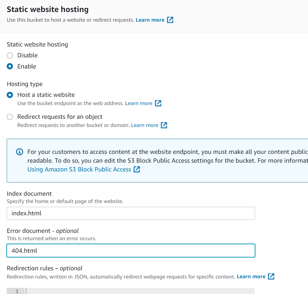 Selecione seu Bucket> Properties> <ativa a opção:> Static website hosting